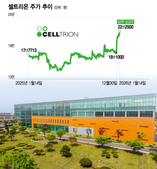 지난 14일 셀트리온의 주가는 21만1500원으로 장을 마감했다. 전반적인 바이오 업종 하락세에 전일 대비 4.3% 하락했지만, 장중 52주 신고가(22만2500원)를 경신하는 등 새해 들어 상승세를 이어가고 있다.