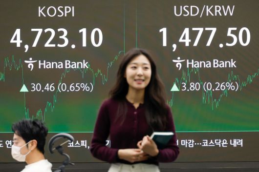 [서울=뉴스핌] 류기찬 기자 = 코스피가 사상 첫 4720선에 장을 마감한 14일 오후 서울 중구 하나은행 딜링룸 전광판에 코스피, 달러/원이 표시되고 있다. 이날 코스피 지수는 전 거래일 대비 30.46포인트(0.65%) 오른 4723.10에, 달러/원 환율은 4.10원 오른 1477.80원에, 코스닥 지수는 6.80포인트(0.72%) 내린 942.18에 장을 마감했다. 2026.01.14 ryuchan0925@newspim.com |