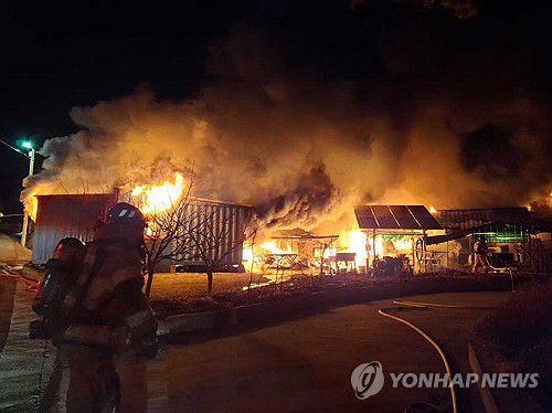 (삼척=연합뉴스) 15일 오전 1시 35분께 강원 삼척시 우지동의 단독주택에서 불이 나 소방대원이 진화작업을 벌이고 있다.