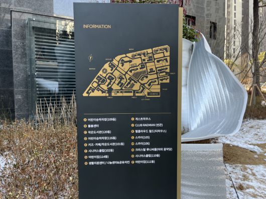 신축 단지답게 커뮤니티 시설도 다양하게 조성됐다. 단지 안내지도에는 어린이 승하차장과 시니어스클럽, 작은 도서관, 야외 음악당 등 다양한 커뮤니티 공간명이 빼곡히 적혀 있다. 물이 흐르는 정원형 조경과 지하 공간을 낮게 파 자연광을 끌어들인 '썬큰(sunken)' 구조도 눈에 띈다. 실내 휴식 공간인 '파크 오아시스'는 가구에서 나무 향기가 날 정도로 갓 조성된 모습이었다.