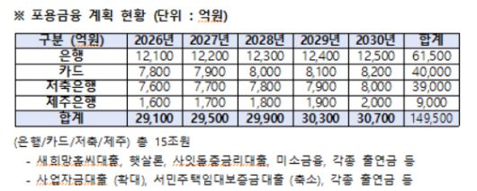 신한금융은 K-성장! K-금융! 프로젝트를 통해 지원하는 110조원 중 15조원을 포용금융에 지원한다. 은행 카드 저축은행 제주은행을 포함해 올해 2조9100억원을 지원하고 ▲2027년 2조9500억원 ▲2028년 2조9900억원 ▲2029년 3억300억원 ▲2030년 3억700억원을 순차적으로 투자한다. 배달사업인 '땡겨요'를 활용한 이차보전대출을 출시한다. 땡겨요는 배민, 쿠팡이츠 등 플랫폼 독과점 시장에서 가맹점과 상생하기 위해 수수료를 절감하고, 데이터를 통해 대출을 공급하는 플랫폼이다. 민관협력형 대출상품으로 최대 1억원의 운전자금을 제공(최대 4% 지자체 이차보전 지원)한다.