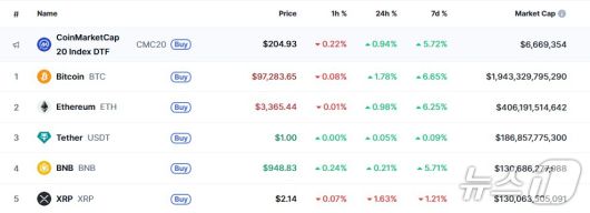 시총 2위 이더리움도 0.98% 상승한 3365달러에 거래되고 있다. 시총 4위 바이낸스 코인은 0.21% 상승한 948달러를 기록하고 있다.