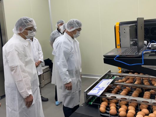 축산물품질평가원 박병홍 원장(오른쪽)이 인공지능 기반 계란 등급판정 기계 시연을 보고 있다. [축산물품질평가원 제공] |