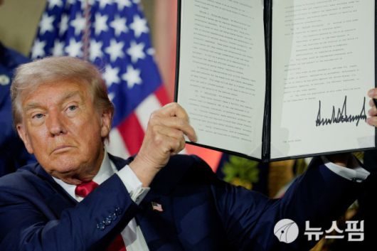 도널드 트럼프 미국 대통령이 2025년 7월 23일 미국 워싱턴 D.C.에서 열린 "AI 경쟁에서 승리(Winning the AI Race)" 정상회의에서 AI 관련 행정명령에 서명한 후 이를 들고 있다. [사진=로이터 뉴스핌] |