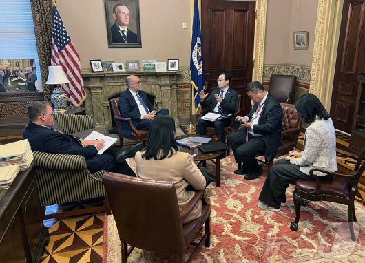 (서울=뉴스1) = 여한구 산업통상부 통상교섭본부장이 14일 미국 워싱턴 D.C. 백악관에서 러셀 바우트 백악관 관리예산실 국장과 면담을 갖고있다. (산업통상부 제공. 재판매 및 DB 금지) 2026.1.15/뉴스1urodoct2@news1.krCopyright ⓒ 뉴스1. All rights reserved. 무단 전재 및 재배포, AI학습 이용 금지.