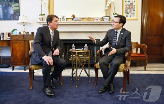 (서울=뉴스1) = 여한구 산업통상부 통상교섭본부장이 14일 미국 워싱턴 D.C. 의회에서 빌 해거티 상원의원과 면담을 갖고있다. (산업통상부 제공. 재판매 및 DB 금지) 2026.1.15/뉴스1urodoct2@news1.krCopyright ⓒ 뉴스1. All rights reserved. 무단 전재 및 재배포, AI학습 이용 금지.