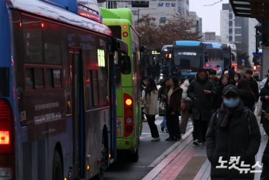파업으로 이틀 동안 중단됐던 서울 시내버스 운행이 첫 차부터 재개된 15일 서울 강서구 한 버스정류장에서 시민들이 버스에 탑승하고 있다.