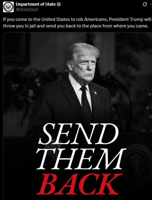 14일(현지시간) 미 국무부 엑스 갈무리. 국무부는 “당신이 미국인들을 착취하기 위해 미국에 온다면, 트럼프 대통령은 당신을 감옥으로 보내고 당신의 출신지로 돌려보낼 것”이라고 적었다. |