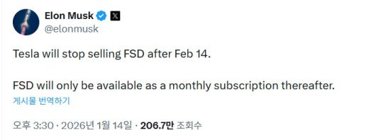 일론 머스크는 14일 자신의 SNS를 통해 "2월 14일 이후 FSD 일시불 판매를 중단할 것"이라며 "FSD는 향후 월간 구독으로만 사용할 수 있다"고 밝혔다.