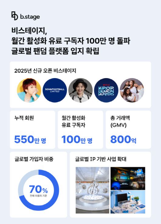[이데일리 윤기백 기자] 글로벌 팬덤 플랫폼 비스테이지(b.stage)가 지난 12월 월간 활성화 유료 구독자 100만 명, 누적 회원 550만 명을 돌파했다고 15일 밝혔다. 팬 경험과 커머스를 연결한 플랫폼 구조를 바탕으로 2025년 연간 총 거래액(GMV) 800억 원을 돌파하며 안정적인 성장 흐름을 보이고 있다.