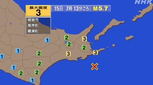 [서울=뉴스핌] 오영상 기자 = 15일 오전 7시 13분경 일본 홋카이도 네무로시 등지에서 진도 3의 지진이 관측됐다고 NHK 등이 보도했다.