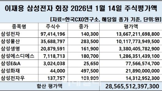 이 밖에도 삼성생명(3조3804억원), 삼성SDS(1조2863억원) 등에서도 1조원 이상 평가액을 기록했다. 한국CXO연구소는 이 회장이 단일 종목 기준 10조원이 넘는 주식평가액을 두 개 이상 보유한 첫 사례라고 설명했다.