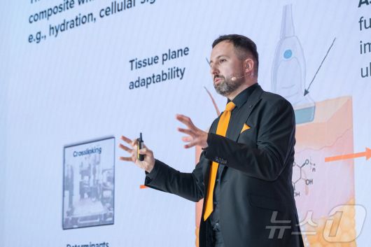 (서울=뉴스1) = 지난 14일 서울 강남구 삼성동에서 열린 벨로테로® 아시아퍼시픽(APAC) 행사에서 라도반 부키체비치 멀츠 에스테틱스 R&D 필러 제형 부문 총괄이 벨로테로®의 CPM 기술에 대해 설명하고 있다. (멀츠 제공. 재판매 및 DB금지) 2026.1.15/뉴스1