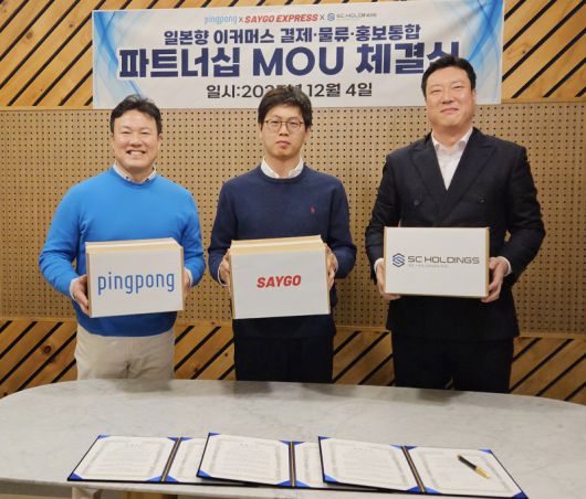 [서울경제TV=박수열기자] 글로벌 커머스 금융 플랫폼인 핑퐁페이먼트는 글로벌 물류 기업 세이고, 일본 전문 풀필먼트 기업인 SC홀딩스와 지난달 4일 서울 삼성동 핑퐁페이먼트 본사에서 한일 간 전자상거래 물류 경쟁력을 강화하기 위한 3자 업무협약(MOU)을 체결했다고 15일 밝혔다.