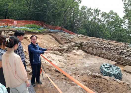유성훈 금천구청장(오른쪽)이 호암산성 석축 발굴 현장을 둘러보고 있다. 금천구 제공. |