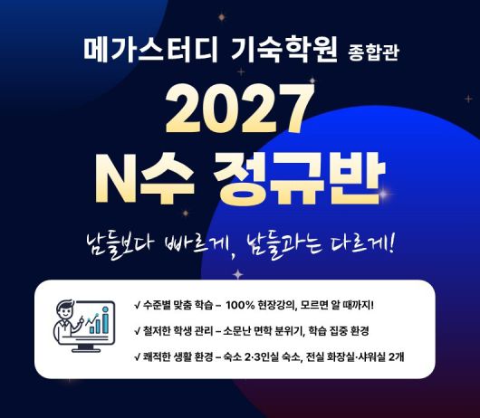 한편 메가스터디 기숙학원 종합관은 2027학년도 수험생을 대상으로 한 N수 정규반을 2월21일 개강하며, 다가오는 17일 학습 시스템과 관리 방식, 생활 환경을 직접 확인할 수 있는 학원 방문 설명회가 예정돼 있다.