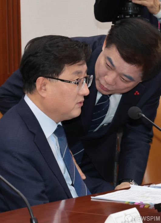 [서울=뉴스핌] 이길동 기자 = 김성환 기후에너지환경부 장관(왼쪽)과 김병욱 청와대 정무비서관이 15일 서울 종로구 정부서울청사에서 열린 국가정책조정회의에서 대화를 하고 있다. 2026.01.15 gdlee@newspim.com