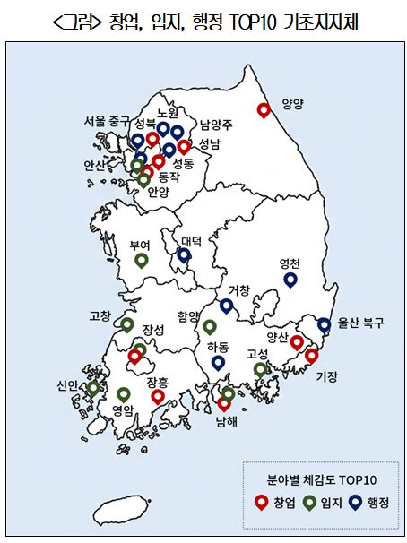 행정편의성 부문에서는 남양주, 안산(이상 경기), 거창, 하동(이상 경남), 영천(경북), 대덕(대전), 울산 북구, 노원, 성동(이상 서울), 서울 중구가 이름을 올렸다.