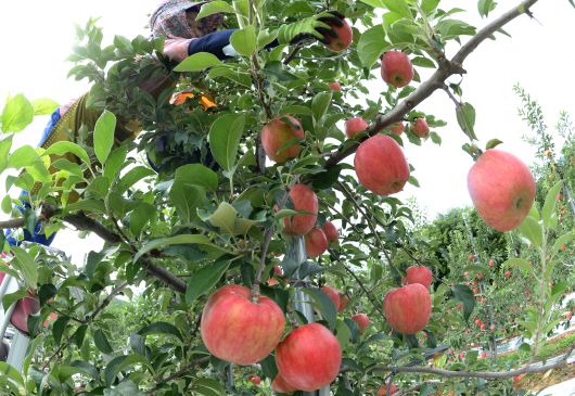 2021년 8월 경남 거창군 고제면 봉산리 느티나무 사과 과수원에서 홍로를 수확 하고 있다./뉴스1 |