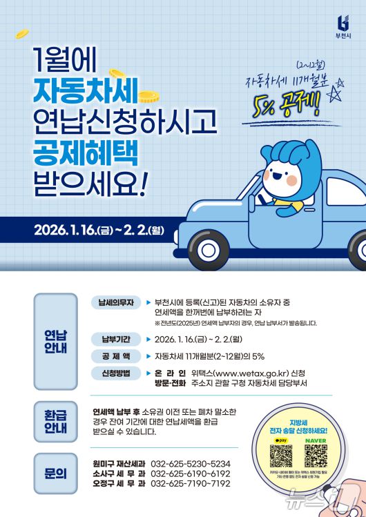 (부천=뉴스1) 이시명 기자 = 경기 부천시는 이달 자동차세를 연납해 납부하면 최대 5%의 세액 공제 혜택을 받는다고 15일 밝혔다.
