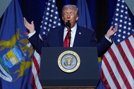도널드 트럼프 미국 대통령이 13일(현지 시간) 미국 미시간주 디트로이트의 모터시티 카지노 호텔에서 열린 디트로이터경제클럽 행사에서 연설하고 있다. 뉴시스 |