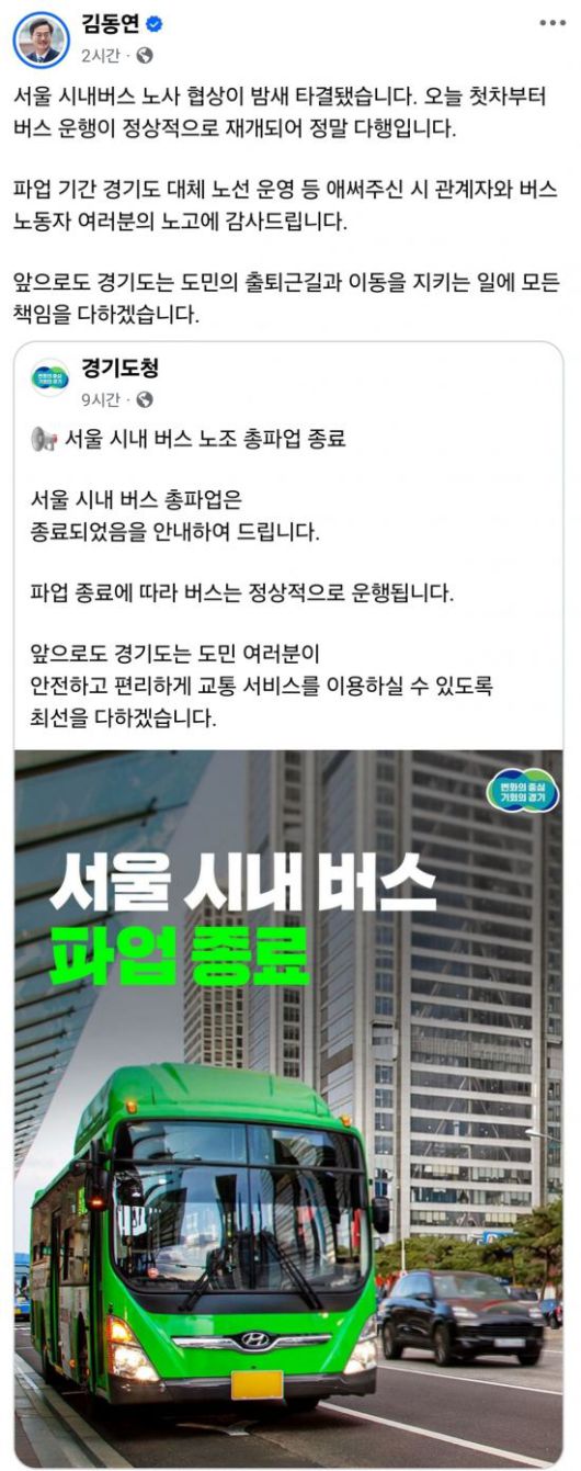 김동연 지사는 15일 자신의 사회관계망서비스(SNS)에 올린 글에서 "서울 시내버스 노사 협상이 밤새 타결됐다"며 "오늘 첫차부터 버스 운행이 정상적으로 재개되어 정말 다행"이라고 말했다.