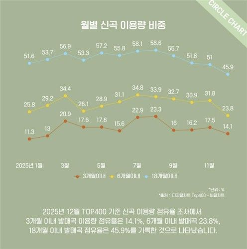 15일 써클차트의 지난달 디지털 음원 순위 상위 400곡을 김진우 음악 전문 데이터저널리스트가 분석한 결과 발매 18개월 이내 신곡이 차지하는 비율은 45.9%였다. 발매 6개월 이내로 범위를 좁히면 23.8%, 발매 3개월 이내 최신곡 점유율은 14.1%까지 감소했다. 김 저널리스트는 “18개월 이내 신곡 점유율이 절반 밑으로 떨어진 것은 해당 조사를 시작한 2024년 7월 이후 처음 있는 일”이라며 “그만큼 신곡이 차트에서 영향력을 발휘하지 못했다는 것을 의미한다”고 설명했다.