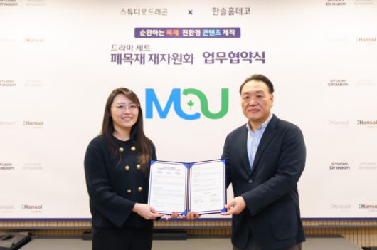 한솔홈데코가 스튜디오드래곤과 서울 마포구 스튜디오드래곤 본사에서 '드라마 세트 폐목재 재자원화 및 친환경 순환 체제 구축'을 위한 업무협약(MOU)을 체결했다고 15일 밝혔다.