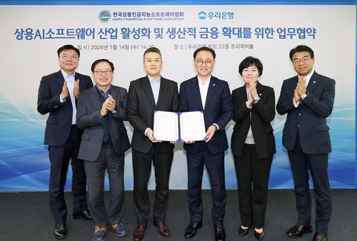 ▲ 우리은행은 한국상용인공지능소프트웨어협회와 업무협약을 체결했다고 15일 밝혔다. 이번 협약에 따라 다양한 산업 현장에서 즉시 활용할 수 있는 범용 패키지형 소프트웨어 관련 유망 기업에 금융 지원을 확대할 계획이다. 아울러 기업금융 특화 채널인 '비즈(BIZ)프라임센터'를 거점으로 협회 회원사들에 상담을 제공할 예정이다. 은행 관계자는 "잠재력을 갖춘 첨단전략산업 기업들이 한 단계 도약할 수 있도록 지원을 아끼지 않겠다"고 말했다. (서울=연합뉴스)