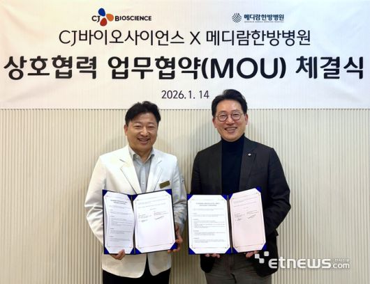 김지호 메디람한방병원 원장(왼쪽)과 윤상배 CJ바이오사이언스 대표가 장내 미생물 분석 관련 업무협약을 체결했다. |