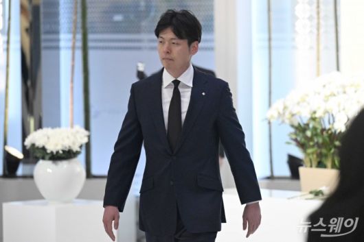 신동빈 롯데그룹 회장의 장남인 신유열 롯데지주 부사장 겸 롯데바이오로직스 대표이사가 15일 오전 서울 송파구 롯데월드타워에서 열린 '2026 상반기 롯데 VCM (Value Creation Meeting·옛 사장단회의)'에 참석하기 앞서 故 신격호 롯데그룹 창업주 흉상에 헌화를 마친 뒤 자리로 이동하고 있다.