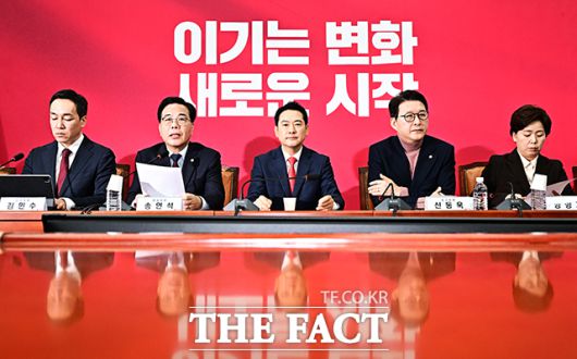 [더팩트 | 국회=배정한 기자] 송언석 국민의힘 원내대표(왼쪽 두번째)가 15일 오전 서울 여의도 국회에서 열린 최고위원회의에 참석해 모두발언을 하고 있다.