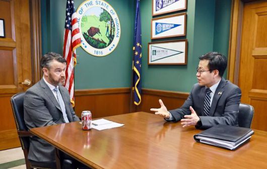 여한구 산업통상부 통상교섭본부장(오른쪽)이 지난 14일(현지시각) 미국 워싱턴 D.C. 의회에서 토드 영 상원의원과 면담하고 있다. / 산업부 |