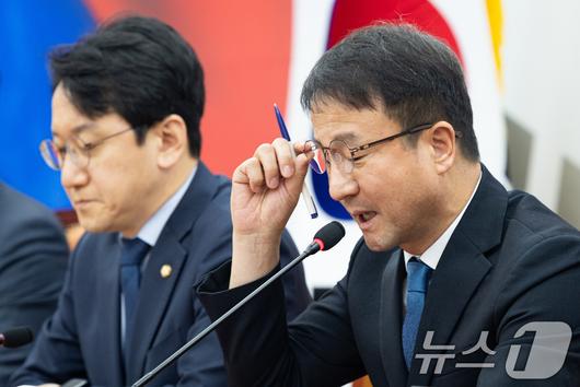 (서울=뉴스1) 유승관 기자 = 한병도 더불어민주당 원내대표가 15일 서울 여의도 국회에서 열린 정책조정회의에서 모두 발언 중 안경을 고쳐 쓰고 있다. 2026.1.15/뉴스1fotogyoo@news1.krCopyright ⓒ 뉴스1. All rights reserved. 무단 전재 및 재배포, AI학습 이용 금지.
