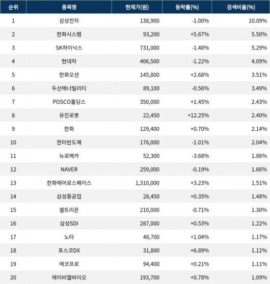 이 밖에도 유진로봇 ▲12.25%, 포스코DX(022100) ▲6.89%, 한화에어로스페이스(012450) ▲3.23%, 한화시스템 ▲5.67%, POSCO홀딩스 ▲1.45%, 삼성SDI(006400) ▲0.53%, 한화 ▲0.70%, 노타(486990) ▲1.04%, 에코프로(086520) ▲0.21%, 에이비엘바이오(298380) ▲0.78% 등이 많이 검색되고 있다.