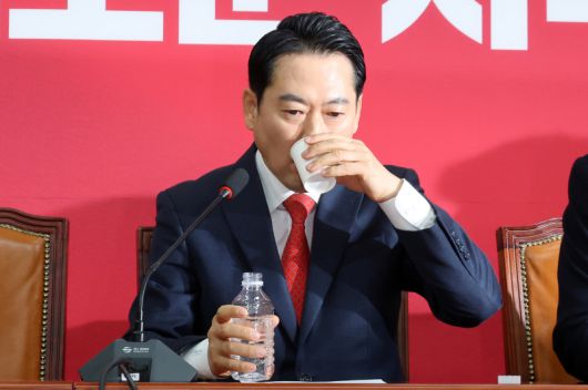 장동혁 국민의힘 대표가 15일 국회에서 열린 최고위원회의에 참석해 목을 축이고 있다. 연합뉴스 |