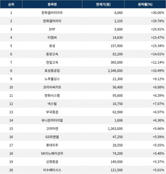 이어 상승률 2위 한화갤러리아(452260)는 현재가 2105원으로 주가가 +29.78% 폭등하고 있다. 상승률 3위 DYP(092780)는 현재 5880원으로 +25.91% 폭등하며 두각을 드러내고 있다. 상승률 4위 티엠씨(217590)는 +15.47% 급등하며 1만 4630원에 거래되고 있다. 상승률 5위 효성(004800)은 +15.34%의 상승세를 타고 15만 7900원에 거래되고 있다.