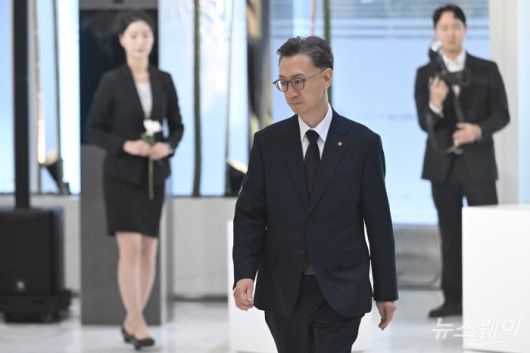 고정욱 롯데지주 공동 대표이사가 15일 오전 서울 송파구 롯데월드타워에서 열린 '2026 상반기 롯데 VCM (Value Creation Meeting·옛 사장단회의)'에 참석하기 앞서 故 신격호 롯데그룹 창업주 흉상에 헌화를 하기 위해 이동하고 있다. 사진=강민석 기자 kms@newsway.co.krnewsway.co.kr |
