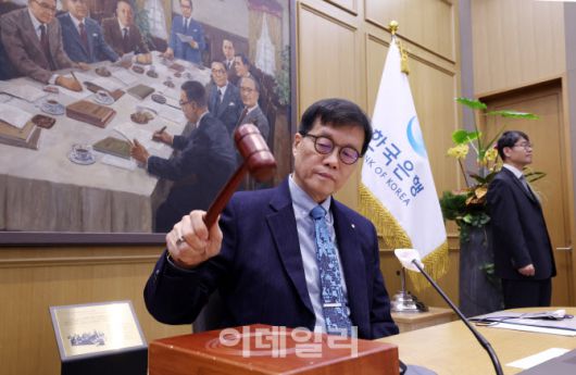 [이데일리 방인권 기자] 이창용 한국은행 총재가 15일 서울 중구 한국은행 본관에서 열린 금융통화위원회 본회의에서 의사봉을 두드리고 있다.
