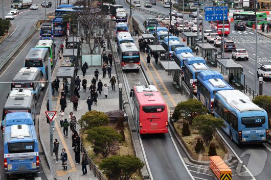 (서울=뉴스1) 김도우 기자 = 서울 시내버스 노사 간 임금 협상 합의와 파업이 철회된 15일 서울역 버스환승센터에 시내 버스가 오가고 있다. 2026.1.15/뉴스1