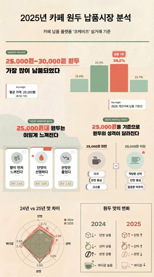 맛의 성향도 변하고 있다. 코케비즈 분석에 따르면 2만5000원대 이상 구간의 원두는 단맛과 산미가 전년 대비 높아졌고, 쓴맛과 바디감은 완화되는 경향을 보였다.