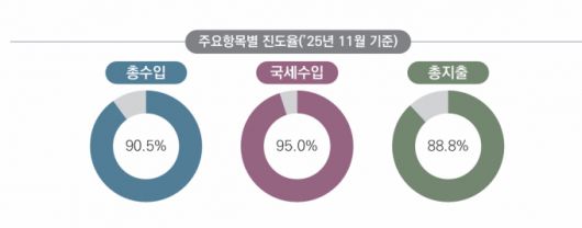 기획예산처가 15일 발표한 '월간 재정동향 1월호'에 따르면 2025년 11월 누계 총수입은 581조2000억원으로 전년 동기 대비 39조2000억원 증가했다. 예산 대비 진도율은 90.5%다