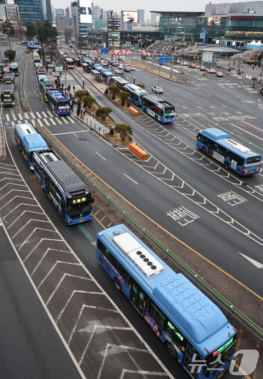 (서울=뉴스1) 김도우 기자 = 서울 시내버스 노사 간 임금 협상 합의와 파업이 철회된 15일 서울역 버스환승센터에 시내 버스가 오가고 있다. 2026.1.15/뉴스1