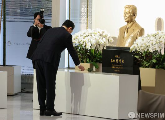 [서울=뉴스핌] 류기찬 기자 = 신동빈 롯데그룹 회장이 15일 오전 서울 송파구 롯데월드타워에서 열린 ‘롯데 창업주 고(故) 신격호 명예회장 6주기 추모식에서 헌화하고 있다. 2026.01.15 ryuchan0925@newspim.com