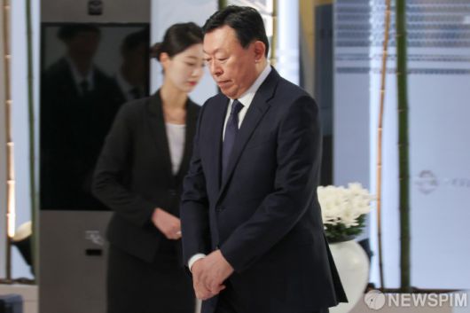 [서울=뉴스핌] 류기찬 기자 = 신동빈 롯데그룹 회장이 15일 오전 서울 송파구 롯데월드타워에서 열린 ‘롯데 창업주 고(故) 신격호 명예회장 6주기 추모식에서 헌화를 마친 뒤 이동하고 있다. 2026.01.15 ryuchan0925@newspim.com