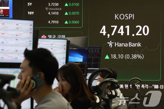 (서울=뉴스1) 이광호 기자 = 코스피가 장중 사상 최고치를 또다시 경신한 15일 오전 서울 중구 하나은행 딜링룸 현황판에 전장 대비 18.10포인트(0.38%) 상승한 4,741.20에 거래되고 있다. 2026.1.15/뉴스1skitsch@news1.krCopyright ⓒ 뉴스1. All rights reserved. 무단 전재 및 재배포, AI학습 이용 금지.