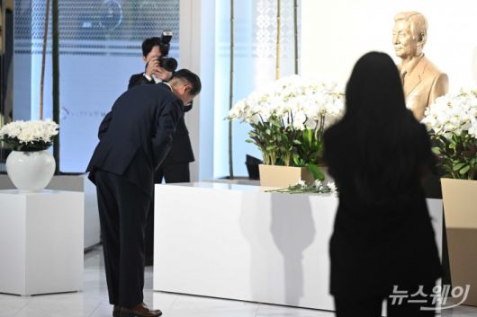 노준형 롯데지주 공동 대표이사가 15일 오전 서울 송파구 롯데월드타워에서 열린 '2026 상반기 롯데 VCM(Value Creation Meeting·옛 사장단회의)'에 참석하기에 앞서 故 신격호 롯데그룹 창업주 흉상에 헌화를 마친 뒤 자리로 이동하고 있다. 사진=강민석 기자 kms@newsway.co.krnewsway.co.kr |