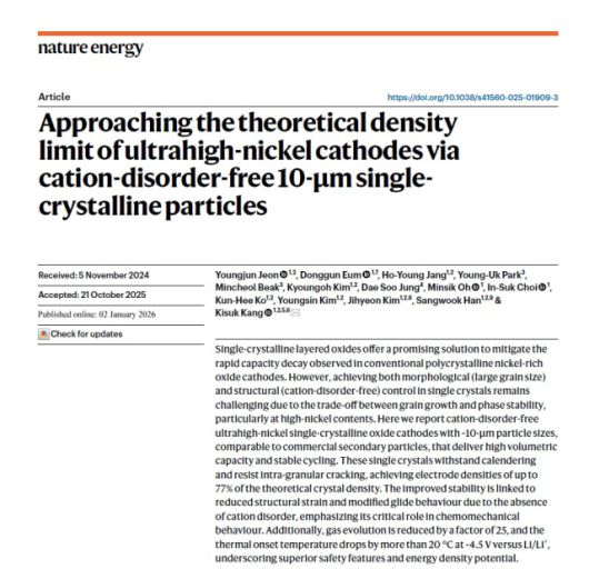연구진은 대형 입자 단결정이 에너지 밀도 구현에 유리하다는 점에도 주목했다. 화학 조성, 온도, 시간 등 합성 조건과 구조 형성 메커니즘을 분석한 결과 일반 양극재 입자 크기의 약 2배 수준인 10마이크로미터(μm) 입자로 구성되고 양이온 무질서가 없는 '울트라 하이니켈'(니켈 함량 94% 초과) 단결정 양극재를 구현했다고 SK온은 설명했다.