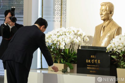 [서울=뉴스핌] 류기찬 기자 = 신동빈 롯데그룹 회장이 15일 오전 서울 송파구 롯데월드타워에서 열린 ‘롯데 창업주 고(故) 신격호 명예회장 6주기 추모식에서 헌화하고 있다. 2026.01.15 ryuchan0925@newspim.com