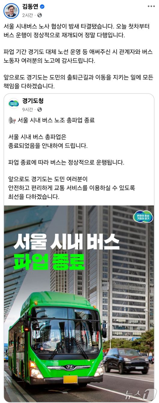 김 지사는 이날 페이스북에 “서울 시내버스 노사 협상이 밤새 타결됐다. 오늘 첫차부터 버스 운행이 정상적으로 재개돼 정말 다행”이라고 적었다.